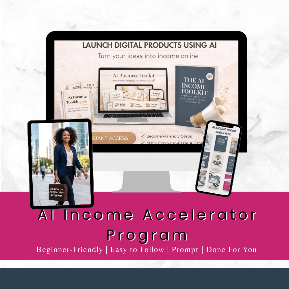 The AI Income Accelerator Program is a step-by-step training designed to help you turn your ideas, skills, or knowledge into a digital product you can sell online. Using the AI Income Toolkit and practical AI-powered tools, this program guides you through choosing a niche, creating your product, building content, and launching your offer with confidence.